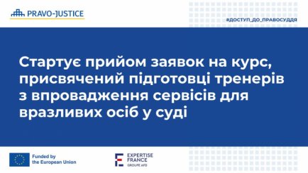 Проєкт ЄС "Право-Justice" оголошує конкурсний прийом заявок для проходження навчання за програмою курсу "Підготовка тренерів з впровадження сервісів для вразливих осіб у суді: міжнародні стандарти та національний досвід в умовах війни".