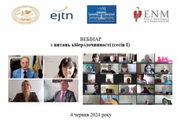 4 та 6 червня 2024 року Національна школа суддів України спільно з Вищою школою магістратури (Італія) та Національною школою магістратури Франції за підтримки Європейської мережі суддівської освіти проводить вебінар з питань кіберзлочинності (дві навчальні сесії) для суддів місцевих загальних і апеляційних судів із метою підвищення рівня їх кваліфікації.