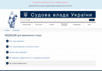 На сайті «Судова влада України» в розділі «Громадянам» з’явилася рубрика «Медіація для вирішення спору». Тут міститься інформація про поняття, процедуру, переваги медіації та її співвідношення з судовим розглядом. Також громадяни можуть довідатися як знайти медіатора для вирішення різноманітних спорів та конфліктів.