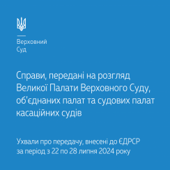 Цього тижня знайомимо вас зі справами, переданими на розгляд об’єднаних палат касаційних судів у складі Верховного Суду відповідно до ухвал про передачу, внесених до ЄДРСР з 22 по 28 липня 2024 року.