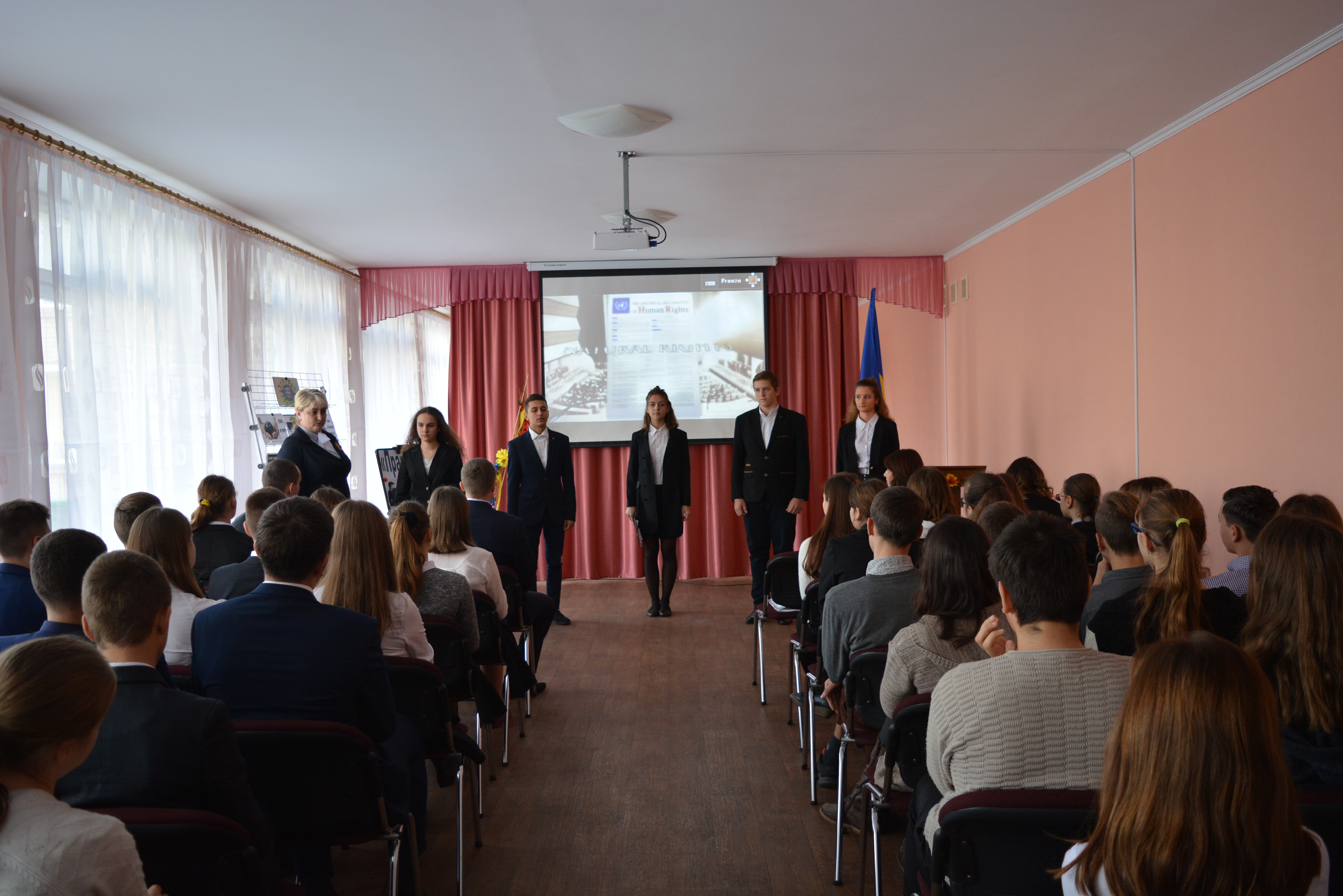 Відкрила захід вчитель права Білоус Лора Сергіївна, яка представила учням гостей. Урок розпочався виступом учнів 11 класу, які розповіли про історію прав людини і окремо розповіли про такі права людей, як право на освіту.