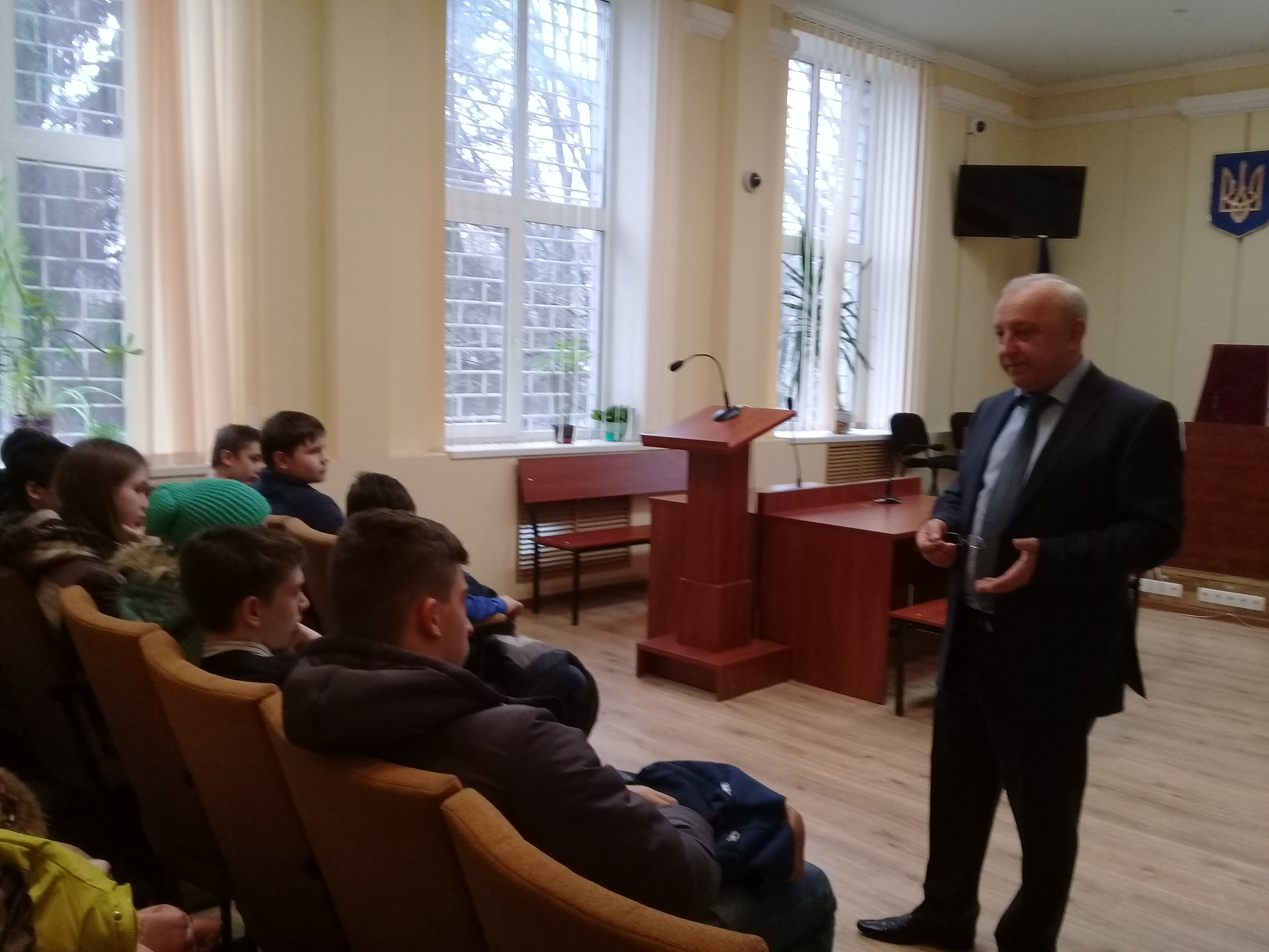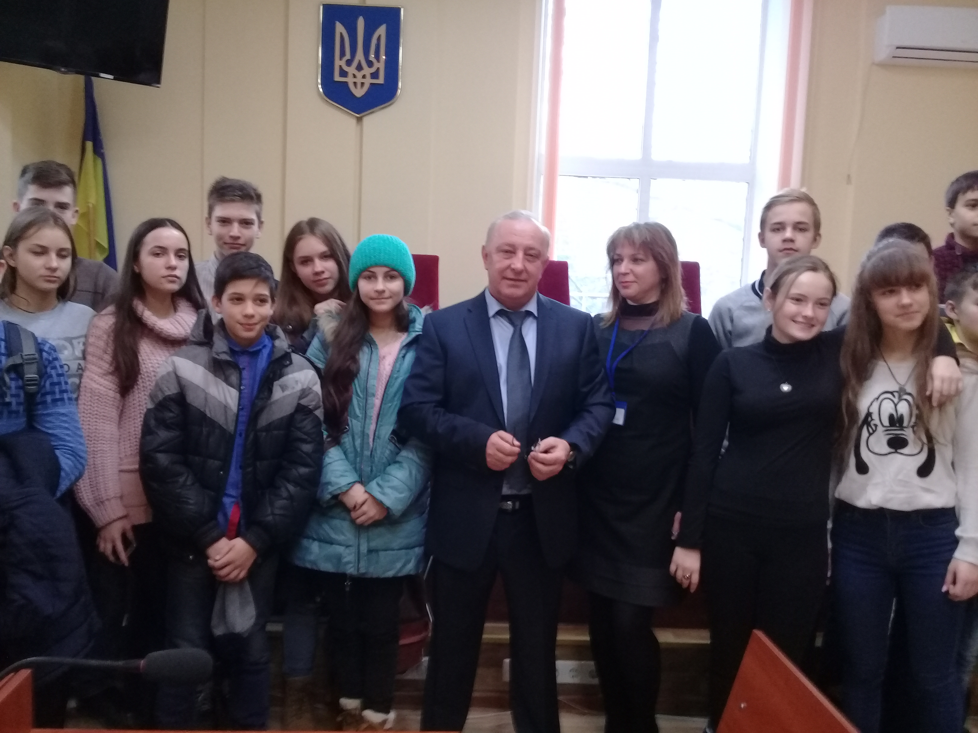 Голова суду Черняк В.Г. провів з учнями бесіду на тему: роль судової влади в Україні, поняття системи судів загальної юрисдикції, поняття професійного судді, судового захисту прав неповнолітніх, порядок застосування до неповнолітнього обвинуваченого примусових заходів виховного характеру, особливості здійснення кримінальних проваджень стосовно неповнолітніх, тощо.