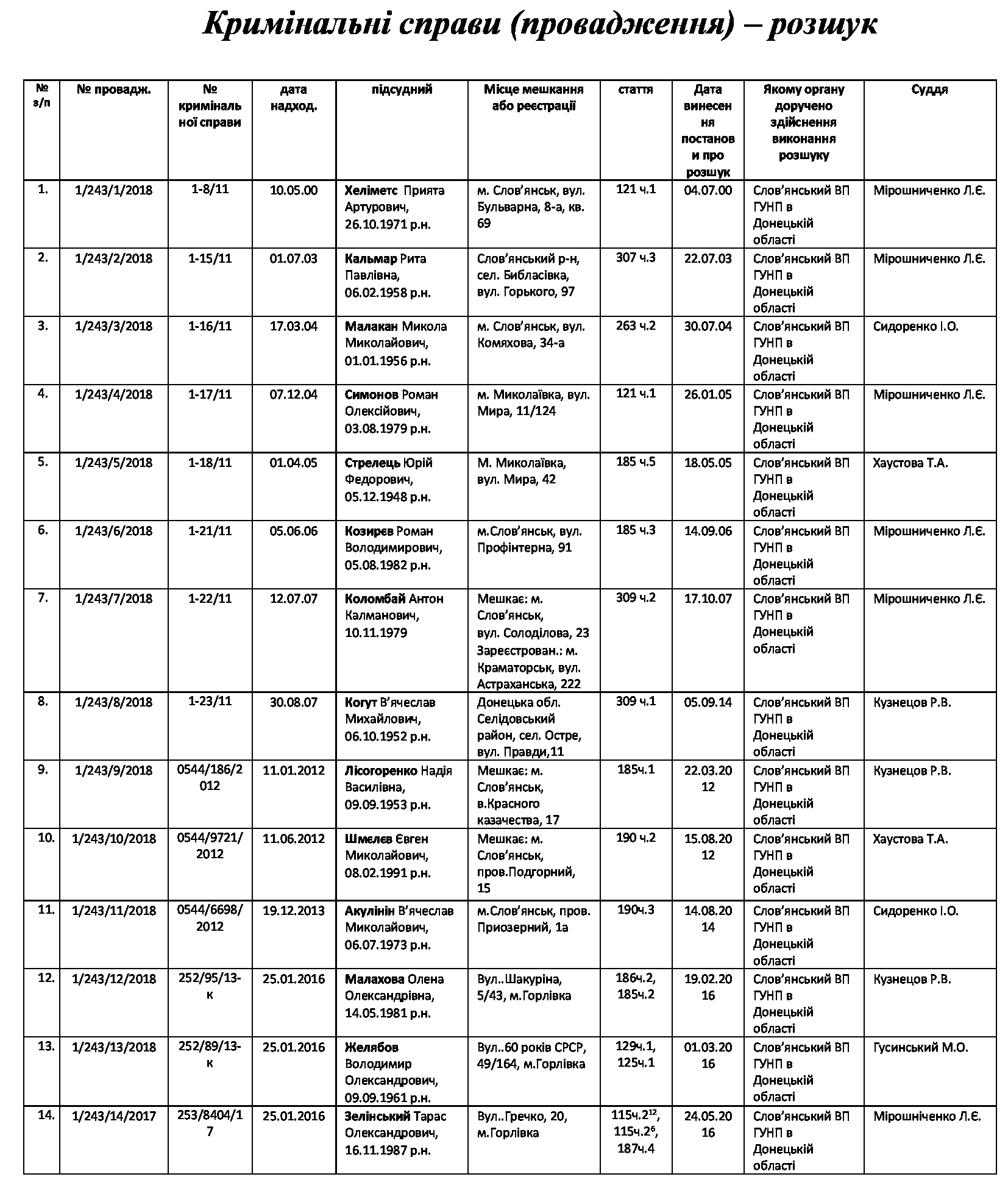 Слов'янський міськрайонний суд Донецької області повідомив про вжиті відомствами заходи з розшуку обвинувачених у 2017 році