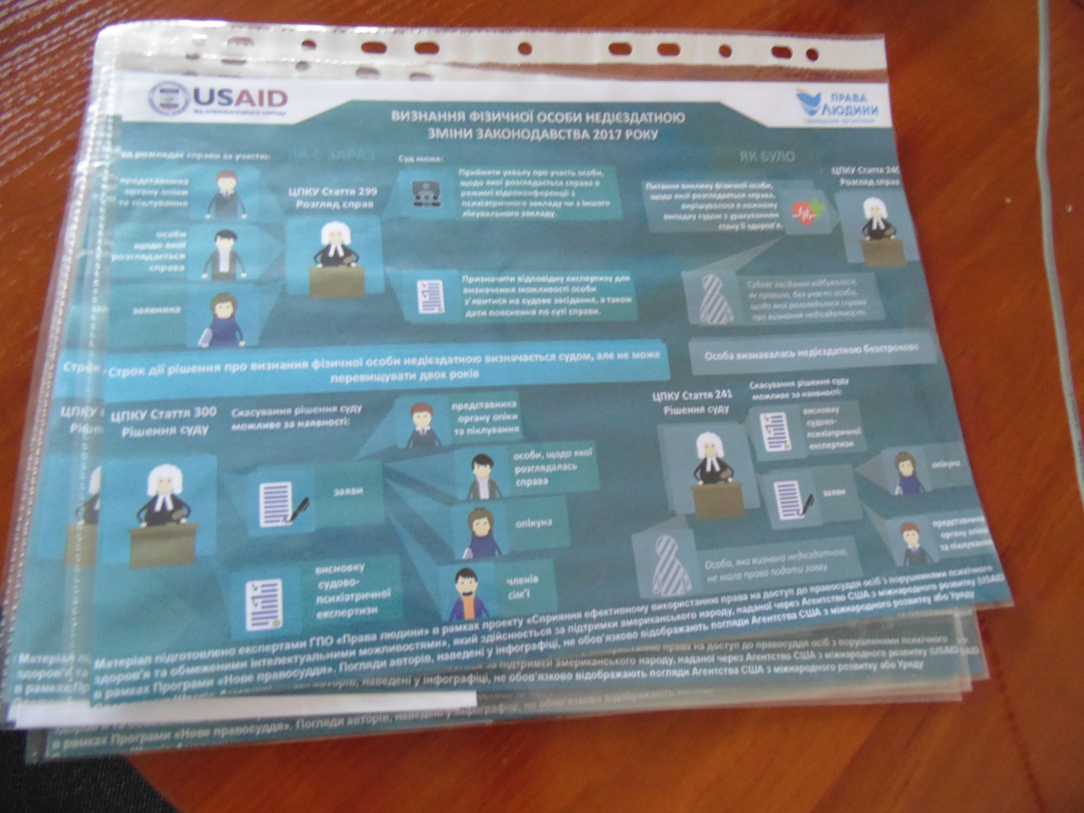 Переглянули усі присутні й інформаційне відео про судову процедуру визнання фізичної особи недієздатною в Україні, яке підготовлено Громадською правозахисною організацією «Права людини» в рамках проекту «Сприяння ефективному використанню права на доступ до правосуддя осіб з порушеннями психічного здоров’я та обмеженими інтелектуальними можливостями», який здійснюється за підтримки американського народу, наданої через Агентство США з міжнародного розвитку (USAID) в рамках Програми «Нове правосуддя».