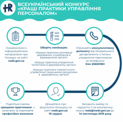 Національне агентство України з питань державної служби оголосило про початок Всеукраїнського конкурсу «Кращі практики управління персоналом» у 2019 році. Конкурс стартує 1 жовтня 2019 року.